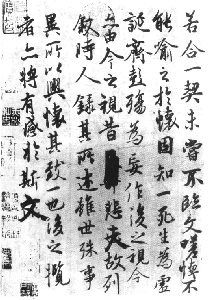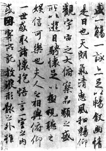 一个叫兰亭的地方举行消灾祈福活动(即“修禊”)。大家分坐溪水两旁,饮酒作诗,王羲之受命为众人的兰亭诗作序。当时“天朗气清,惠风和畅”,周围有“崇山峻岭,茂林修竹”,王羲之身在其中.“游目骋怀”,“仰观宇宙之大,俯察品类之盛”,既“极视听之娱,信可乐也”,又乐而生悲,“临文嗟悼”,于是乘着洒兴,用蚕茧纸、鼠须笔书写下这一文学和书法的名篇。其中有增删涂抹的痕迹,可见此帖是即兴之作。待到他醒过酒来,“他日更书数十百本”,总觉得不如那一本好。