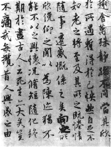 章法,书写时顺势而下,没有刻意追求丁巧,字列之间或宽或窄,有些字列旁边有添字,还有多处涂改,在率意之中显出天然之美。篇中偶有笔画粗重的字,分外醒目,也有形体颇大的字.显得整中有变,又可以看出率意之中的精心。古人评价其章法时说:“若千丈文锦,卷舒展玩,无不满人意。”丰富多彩的笔画和多姿多态的结体,造成满篇飞动的神采,如同创造了一个繁花似锦、春意盎然的百花园。这是王羲之创造力焕发的表现。