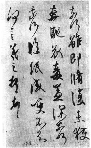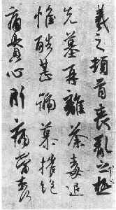 在结体方面,基本上采用往左倾侧之势,比《兰亭序》字的倾侧感更强。横画右端上提,竖画下端往右偏移;字的右上角往上突,左下角往下坠。“势如斜而反正”,看似不稳,其实很稳,显得生动活泼而不呆板。第六列“奔驰”两字动感很强,若有奔驰之状。第三列“摧”字结体奇特,而别有情趣。第一列“羲”字左密右疏,第七列“感”字左疏右密,如此疏密也许是无意中的创造,但宛如精心设计、安排的。有些字虽然潦草.但仍不失其结体的和谐、美感。